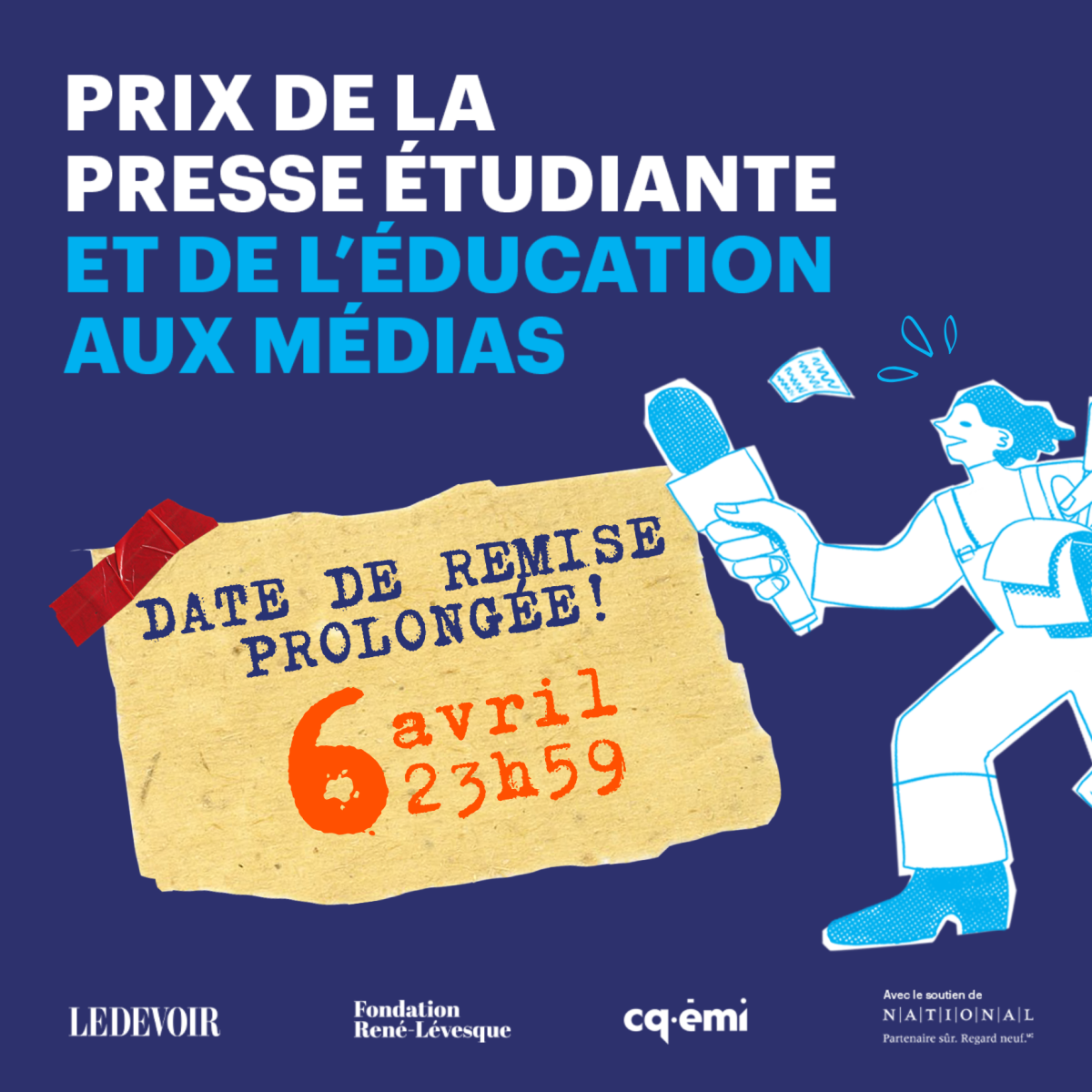 L’appel à candidatures pour le Prix vidéo René-Lévesque en éducation aux médias est prolongé jusqu’au lundi 6 avril avant minuit. Il n’est pas trop tard pour participer et courir la chance de gagner l’une des trois bourses de 2 500 $, 2 000 $ ou 1 500 $, toutes remises par la Fondation René-Lévesque. Une occasion en or de se faire connaître dans le milieu journalistique!